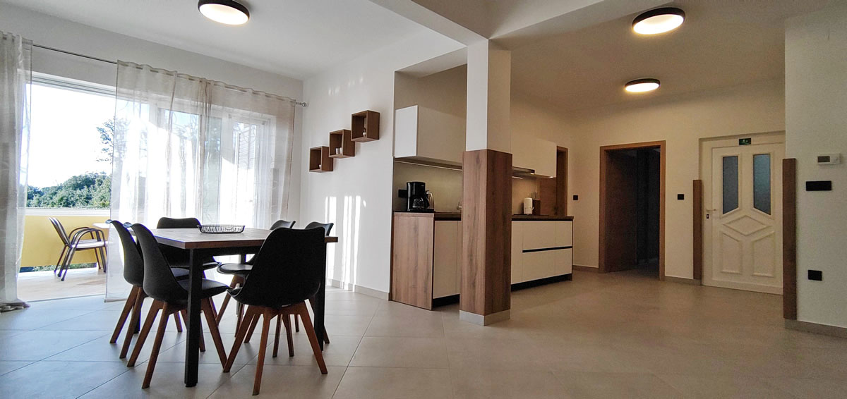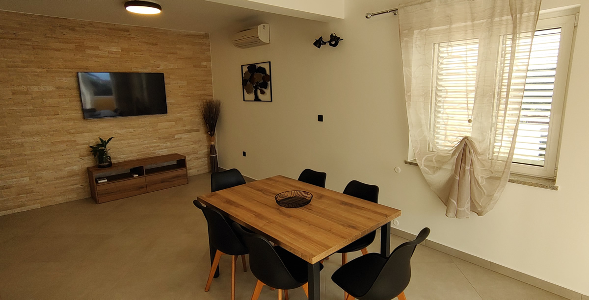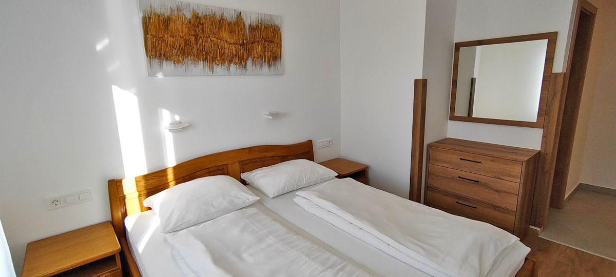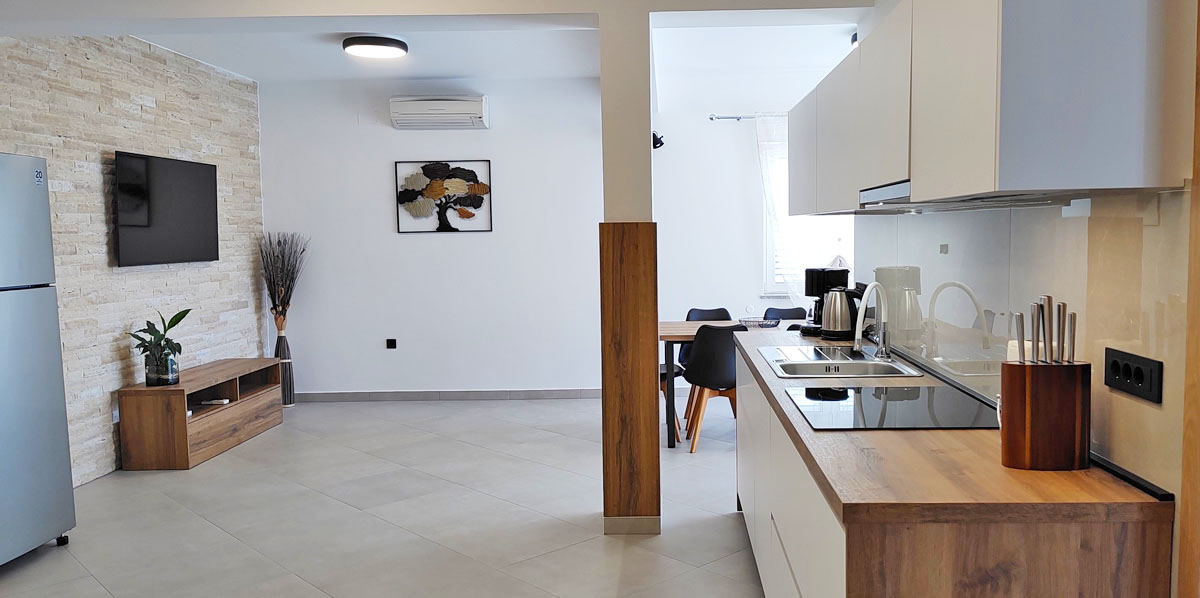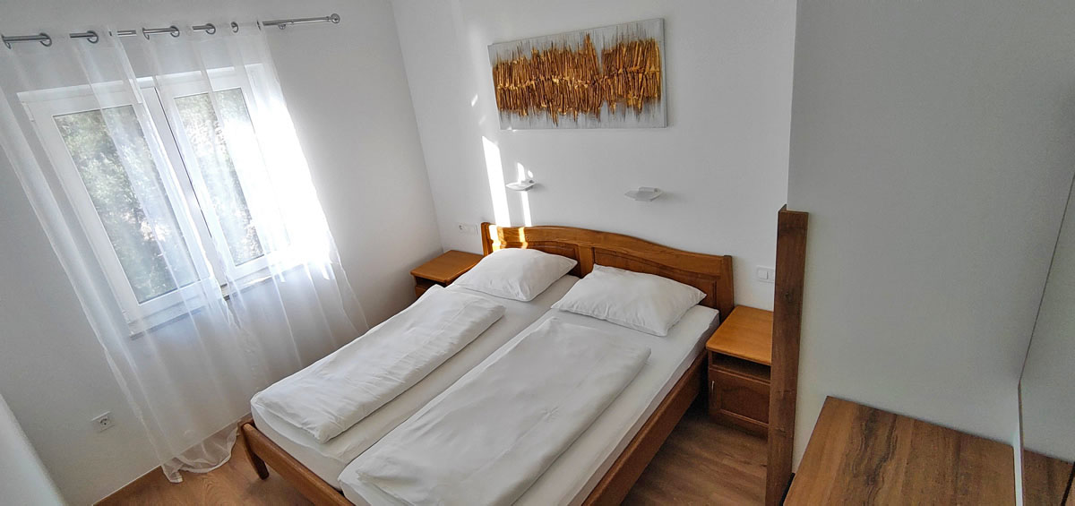 80m2, 2 spavaće sobe, dnevni boravak sa sofom za 2 osobe, kuhinja, 2 kupaone, 2 balkona s pogledom na more